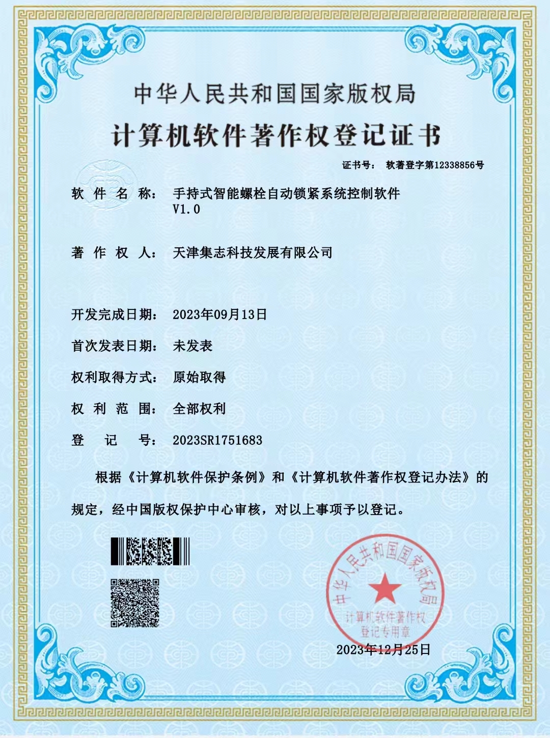 获得多通道智能螺栓预紧力测试系统软件著作权。